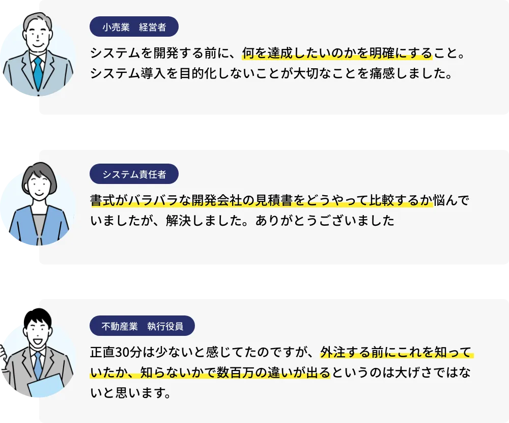 何から手を付けてよいか分からない場合であっても、解決したい課題は何かは明確にしておいてください。例えば、基幹システムのリプレースを行いたいのだがどこへ頼めばよいのか。稟議を取るために開発の相場観を知るにはどうすればいいか。
